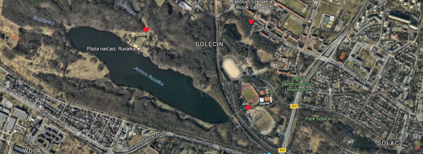 Proponowane lokalizacje stacji PRM zaznaczono czerwonymi punktami na zdjęciu satelitarnym Nowe stacje PRM nad Rusalka.PNG