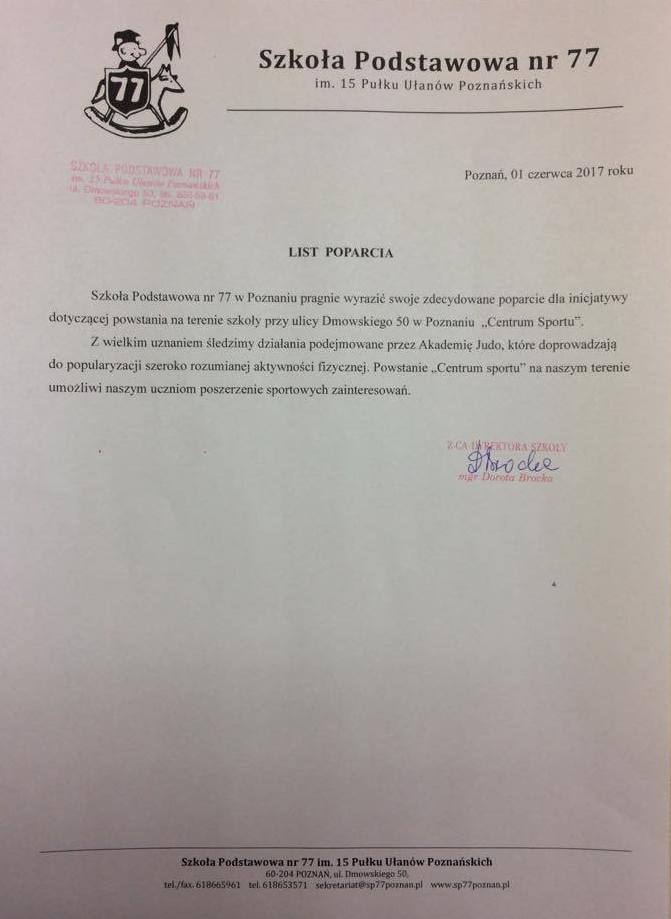Decyzja: Projekt NIE jest rekomendowany do realizacji przez JednostkęKarta Oceny Projektu Projekt jest rekomendowany do realizacji: nieUzasadnienie Wg projektu nie będzie to sala gimnastyczna tylko -Centrum Sportu Klubu Sportowego Akademii Judo w Poznaniu- z nowoczesną halą sportową o powierzchni 1000m2 wyłożoną specjalistyczną matą do sportów walki. Na terenie obiektu znajdować się również będzie sala do fitnessu, sauna, siłownia, fizjoterapia , sklep ze sprzętem specjalistycznym oraz szatnie .Funkcja sali gimnastycznej dla uczniów Szkoły Podstawowej nr 77 w Poznaniu będzie minimalna. Ponadto projekt zakłada budowę drogi dojazdowej i budowę parkingu dla samochodów na terenie obecnie istniejącego boiska i bieżni do skoków w dal ( teren dawnego Gimnazjum nr 51 - obecnie Liceum Terapeutyczne). Budowa sali dla Klubu Sportowego Akademii Judo w Poznaniu-zwana w projekcie Centrum Sportu przy Szkole Podstawowej 77 TO PROJEKT KOMERCYJNY dla którego realizacji wykorzystany zostanie budynek oświatowy i koszty jego utrzymania ponosić będzie M.Poznań. Jednocześnie projekt dotyczy wyspecjalizowanej grupy odbiorców a nie uczniów i młodzieży łazarskiej, gdyż udział w zajęciach jest płatny.Zespół Obradował w składzie: opiniowanie Uchwała RO z dnia 23.08.2017 rKryteria zasadnicze Czy projekt jest funkcjonalny? - nieCzy projekt jest zgodny z istniejącą infrastrukturą? - nieCzy realizacja projektu pozytywnie wpłynie na otoczenie? - nieCzy projekt zaspokaja potrzeby lokalne? - nie